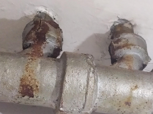 3、先把鑄鐵管拿鑄鐵焊條改成立式朝向下水,接著在后接管件頂端預置一個接頭,再把自家下水的PVC管接到接頭里面,把此接頭朝著自家下水的窟窿,之后在鑄鐵接頭內,PVC管周遭打上防水膩子,最后抹上防水膠即可。